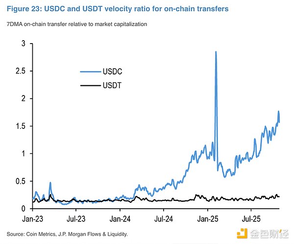 还值得注意的是,2025 年市场结构出现了一个极具信号意义的翻转:尽管 USDT 在市值存量上仍保持领先,但 USDC 的链上年交易额(18.3 万亿美元)首次反超 USDT(13.3 万亿美元)。 这一变化主要得益于 USDC 在 DeFi 协议中更高的资本复用率,以及欧美机构在《Genius 法案》生效后,更倾向于使用合规性更强的 USDC 进行大额结算与跨境支付。