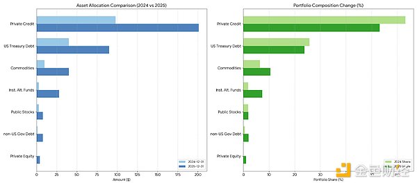 全天候的抗通胀体系:大宗商品规模同比增长约 4 倍(占比升至 10.6%),叠加私募股权从零到一完成建仓,RWA 市场开始形成「股 + 债 + 商品 + 另类」的组合结构,为链上构建全天候策略奠定基础。