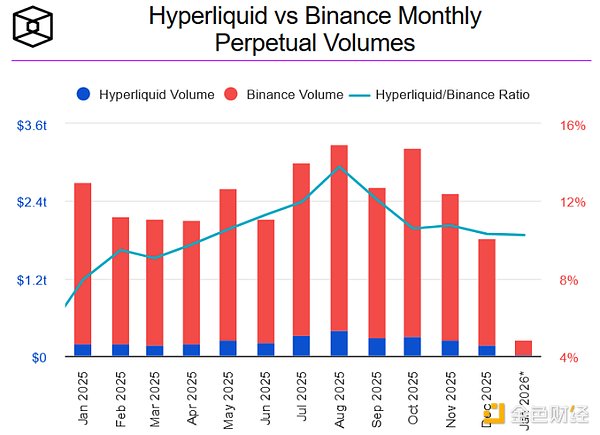 从相对结构看,Perp DEX 与 CEX 合约交易量的比值从年初的 6.34% 攀升至 11 月峰值的近 20%,而以头部 Hyperliquid 为例,其与 Binance 的月度衍生品交易量比值年内由 8% 提升至近 14%。这一系列数据表明,随着基础设施的完善与用户习惯的改变,Perp DEX 已突破流动性瓶颈,正逐步挑战传统现货 DEX,成为承接链上资金的下一代核心流量池。