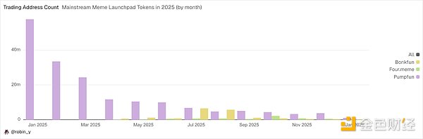 但从主要 Meme Launchpad 的交易量与交易地址数数据来看,Meme 热点的反复出现,并未同步带来链上整体流动性的持续修复,类似 2025 年初特朗普币那种覆盖全市场的 Meme season 正在变得越来越难以复制,2026 年 Meme 更可能呈现结构性行情:围绕特定热点、特定叙事窗口出现阶段性炒作机会。