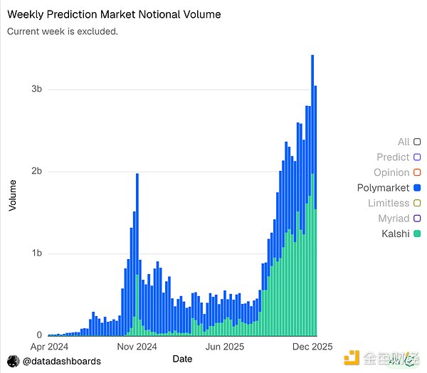 2025 年,预测市场完成了从加密边缘产品向主流金融应用雏形的关键跃迁,整体交易规模与参与度显著抬升。当前主流预测市场的月度交易量已稳定超过 100 亿美元,年内累计交易量超过 400 亿美元。尽管其绝对体量仍明显小于股票、期货等成熟金融市场,但作为一个独立的新资产形态,预测市场展现出了极为突出的增长斜率,已进入明确的加速扩张阶段。