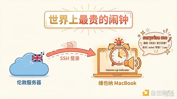 Peter 说他把 AI 当闹钟用。AI 跑在伦敦的服务器上,用 SSH 登录他在维也纳的 MacBook,调高音量叫他起床。