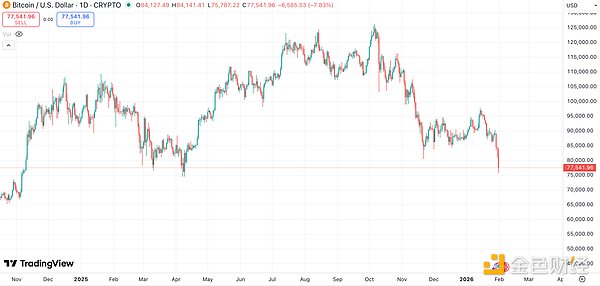 北京时间 2026 年 2 月 1 日凌晨,比特币短时跌破 76000 美元,时隔近两年半再次跌破了 Strategy 的成本线,也是 自 2025 年 4 月 12 日以来首次跌破 8 万美元关口,距离 2025 年 4 月 7 日创下的 74500 美元左右的低点仅一步之遥。