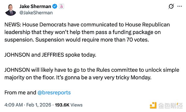 据新华社报道,北京时间 1 月 31 日晚间,伊朗班达尔阿巴斯港一栋居民楼发生爆炸。处理全球约 20% 海运石油的霍尔木兹海峡关键石油枢纽的不安定,叠加美伊冲突加剧,进一步提升了市场对中东局势的担忧。针对国际局势的避险可能只是诱因,Punchbowl News 创始人于今日凌晨 4 时许发推称,众议院民主党议员已告知众议院共和党领导层称,他们不会在当前暂停拨款的情况下协助共和党通过拨款方案。这让原本被认为只会持续几天的政府停摆,可能演变为数月内的第二次长时间停摆。