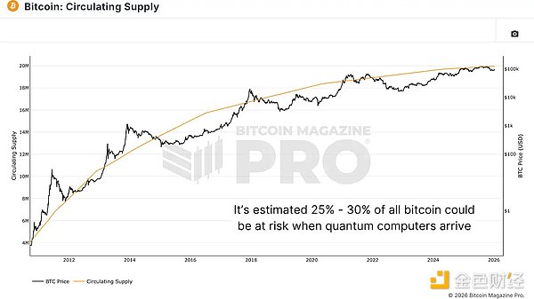 比特币正面临其首个真正的生存威胁,这并非来自政府禁令或市场崩溃,而是来自量子计算。存放在中本聪钱包中的 110 万枚比特币(价值约 1000 亿美元),以及占流通总量约 25% 的比特币,目前都暴露在极易受到量子攻击的老旧加密密钥之下。当量子计算机成熟时——无论是 5 年还是 25 年后——这些比特币将被破解。