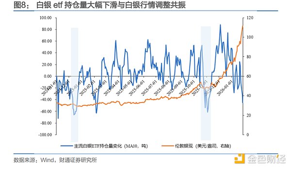 财通证券补充了逼仓与期权 Gamma 挤压的因素。截至 1 月 29 日,沪银主力合约虚实盘比高达 8.75,显著高于历史同期;同时,大量散户买入看涨期权,迫使做市商买入期货对冲,推高价格。一旦交易所强化干预(如 CME 针对金银保证金已上调 6 次),资金流出,这种正反馈循环瞬间逆转为崩塌。此外,白银 ETF 持仓量大幅下滑也是重要的调整信号。