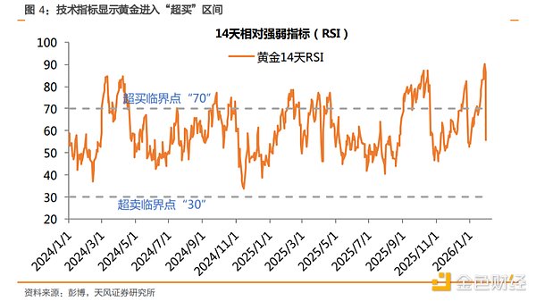 3. 根本原因:极致拥挤的投机仓位与获利了结。华泰证券指出,暴跌前有色(尤其是白银)是全球做多最拥挤的品种。天风证券数据显示,黄金 14 天 RSI 指标在 1 月 28 日突破 90,为本世纪以来首次,显示极度「超买」。