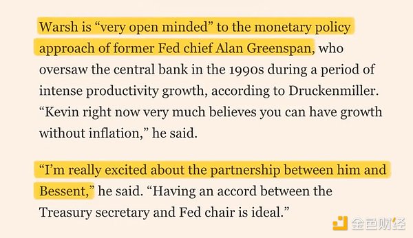 Warsh 的工作和他的任务是运行格林斯潘时代的剧本。特朗普说过这点,Bessent(财政部长提名人)也说过。这里篇幅太长无法展开,但这意味的是:降息,让经济过热,并假设 AI 带来的生产力提升会压制核心 CPI。就像 1995 年到 2000 年那个时代一样。