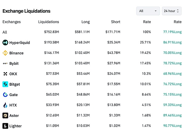 一是在最近几天的波动行情中,Hyperliquid 的爆仓数据已完成了对币安的反超。如下图所示,最近 24 小时 Hyperliquid 的爆仓金额约为 1.93 亿美元,币安则为 1.46 亿美元。