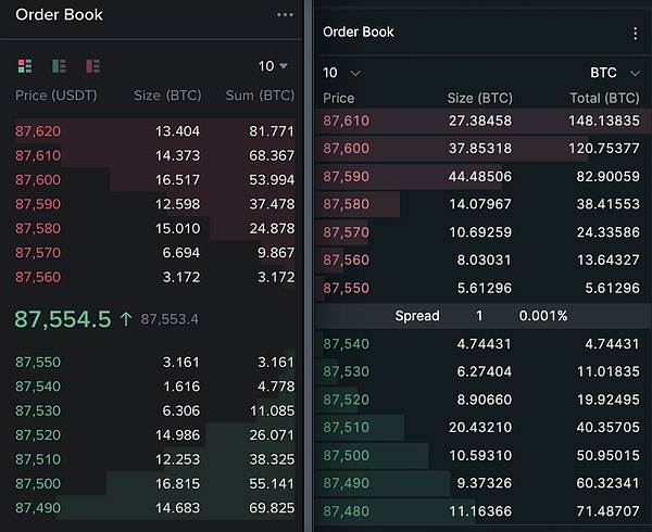 第二件事是,上周 Hyperliquid 的创始人 Jeff 曾于 X 贴出了该平台(下图右侧)与 Binance(下图左侧)上的 BTC 合约订单簿对比。图表显示,Hyperliquid 上 BTC 的买卖价差更窄、挂单深度则更厚。