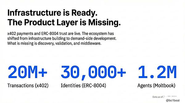 x402的支付体系与 ERC-8004 的信任机制已经上线——整个生态系统正在从“基础设施建设阶段”转向“需求侧开发阶段”。