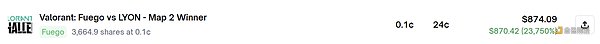 它以单价 0.1¢价格买入了 3,664.9 份的 Fuego 获胜,最终这笔交易回报高达 874.09 美元,回报率则达到恐怖的 23,750%!