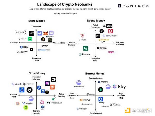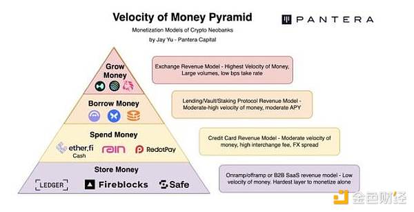 最顶端是「生钱」,钱的流速最快(比如 Hyperliquid 收交易手续费),往下是「借钱」(靠利息变现),再是「花钱」(靠交换费和外汇点差),最下面是「存钱」(靠出入金费用和企业集成)。