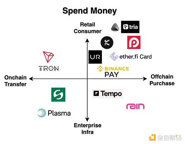 第二类加密数字银行的选手,主攻「用加密花钱」。和「存钱」一样,我们也可以切两刀来画这张地图:一刀是「链上转账 vs 链下购物」(比如买咖啡);一刀是「零售应用 vs 企业基建」。