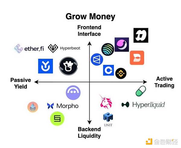 加密数字银行和用户的第三种关系,是「帮用户生钱」。这也是加密行业创新密度最高的一块——质押金库、永续合约、代币发行平台、预测市场,好几个从 0 到 1 的发明都落在这里。和前面一样,这张地图也可以切两刀:被动收息 vs 主动交易,前端界面 vs 后端流动性。