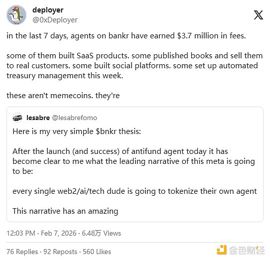 “卖铲子”逻辑:投机性智能体Token价格令人惊叹,但约 80% 的交易费用会流向创造它们的基础设施。在过去,没有这种量化点,但现在价值正向身份(ERC-8004)、支付(x402)、Token发行(Clanker)和金融层(Bankr)汇聚。