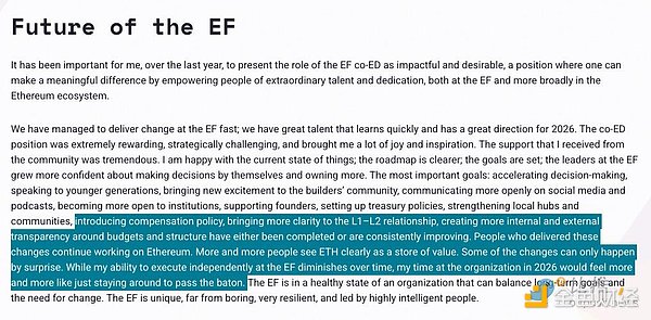 第三,也是最值得玩味的一句:「基金会的领导层越来越有信心自己做决定、自己掌控更多事务。随着时间的推移,我在基金会独立执行的能力在减弱。如果继续待下去,2026 年我更多只是在『等着交棒』。」
