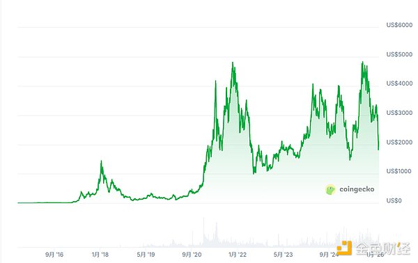 换算一下更扎心:2018 年 1 月,ETH 首次站上 1400 美元。那 1400 美元按美国 CPI 通胀复利调整,到 2026 年 2 月相当于约 1806 美元。