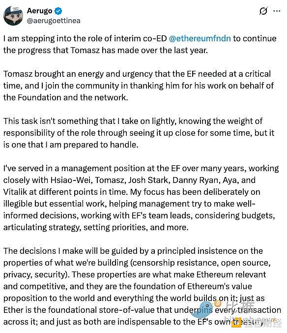 以太坊基金会联合执行主任 Tomasz Stańczak 宣布,将于本月底卸任。这距离他与 Hsiao-Wei Wang 在去年 3 月共同接替长期掌舵的 Aya Miyaguchi、组成新的领导核心,仅仅过去了 11 个月。
