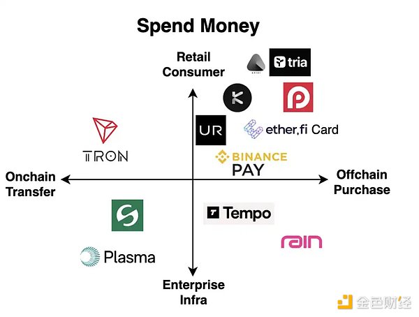 与「用加密方式存钱」类似,我们同样可以沿两个维度对「用加密方式花钱」的应用进行划分:一是从链上转账到链下消费(例如买一杯咖啡);二是从面向零售消费者的应用到面向企业的基础设施。
