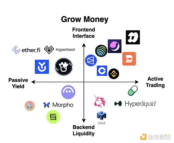 「加密新型银行」与用户建立的第三种关系,是帮助用户实现资金增值(grow money)。这是加密领域中创新最为密集的板块之一,催生了从 0 到 1 的多种金融原语——从质押金库、永续合约交易,到代币发行平台与预测市场。与前文类似,我们同样可以沿着两个维度来对「资金增值」类应用进行分类:从被动收益到主动交易,以及从前端界面到后端流动性。