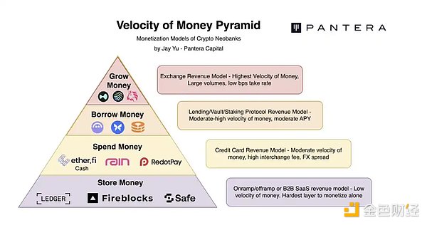 位于金字塔顶端的是资金增值(growing money),其资金周转速度最高(例如 Hyperliquid 的交易手续费);其次是借贷(通过利息变现);再往下是支付(通过手续费与外汇价差);最底层则是存储(主要通过出入金费用与 B2B 集成变现)。