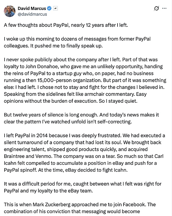 2月3日,PayPal前总裁David Marcus在X上发布长文,罕见地激烈批评了他曾为之付出心血的这家公司。