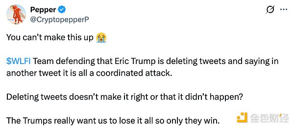 也有一些观点认为,WLFI 之所以下场辟谣是因为 Eric Trump 删帖这件事造成了一些不好的后果,想将锅甩给「不存在的黑客」来平息众怒。最直接的理由就是,如果黑客真的「入侵」了多名 WLFI 联创的 X 账号,仅仅是取消转推实在太不合理。