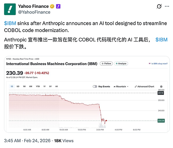 当Anthropic宣布Claude Code可以简化COBOL代码工作时,市场反应相当直接:IBM股价大跳水,暴跌超13%,创下自2000年10月以来最大的单日跌幅。