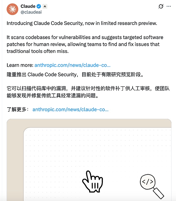 紧接着,就在上周五,Anthropic发布了其Claude Code软件新增功能Claude Code Security,称该功能可以扫描代码库中的安全漏洞,并找出软件漏洞供人工审查。