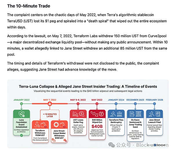 而本周,Terraform Labs 的破产管理人向曼哈顿联邦法院提起诉讼,指控 Jane Street 利用内幕消息提前操纵了 Terra Luna 在 2022 年 5 月的崩盘。这场崩盘导致 400 亿美元的市值蒸发,并引发连锁反应,最终导致 Celsius、Three Arrows Capital 和 FTX 等公司倒闭。