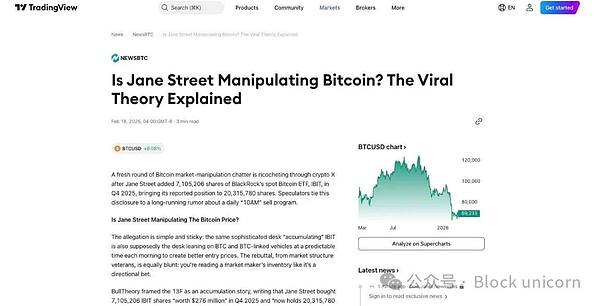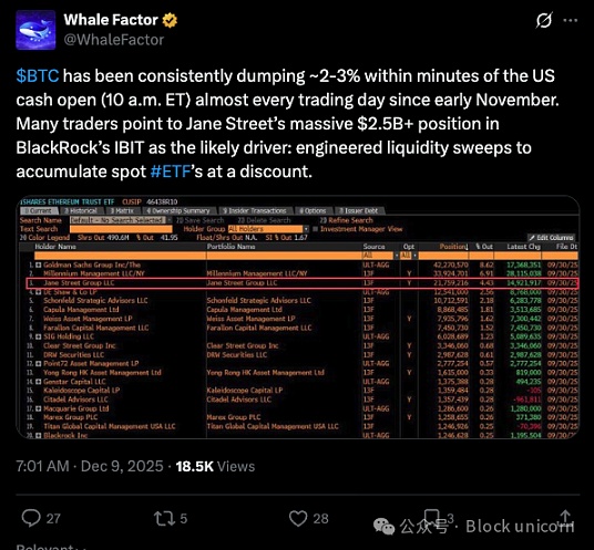 矛头直指 Jane Street,而且理由充分。Jane Street 是贝莱德旗下 IBIT(全球最大的现货比特币 ETF)仅有的四家授权参与者之一。其他三家分别是 Virtu Americas、摩根大通证券和 Marex。作为授权参与者,Jane Street 拥有创建和赎回 ETF 份额的独特权限,这意味着他们直接参与了比特币在机构投资者之间的流动。