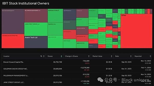 他们的 13F 文件证实了其大规模的持仓。截至 2025 年第三季度财报,Jane Street 持有价值 57 亿美元的 IBIT 股票。他们在 2025 年第四季度又增持了 2.76 亿美元,使其总持股量超过 2000 万股,按年底价格计算价值约 7.9 亿美元。在持股高峰期,他们持有的 IBIT 股票价值接近 25 亿美元。