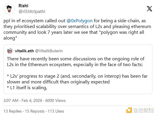 Polygon 在 2021 年牛市中对以太坊至关重要,为 ETH 作为资产的增长贡献良多。但没错,它不是 L2,不配得到以太坊社区的赞赏。如果 Polygon 是一个 L1,它的估值会高得多。
