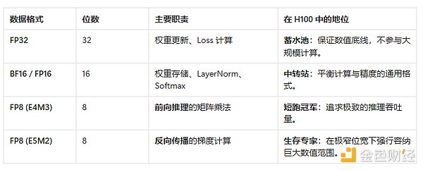 英伟达 V100 支持 FP16,到了 H100 变成 FP8,B200 进一步降至 FP4。