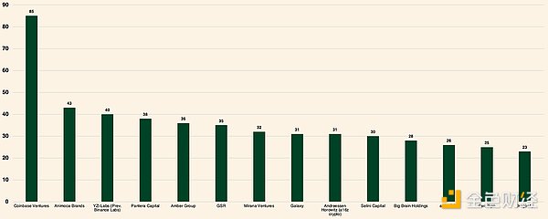 Coinbase Ventures 仍然是该领域最活跃的投资者,强调构建“Base”生态系统是链上盈利能力的长期驱动力。下表总结了过去 12 个月(2025 年 2 月至 2026 年 2 月)交易数量排名前列的投资者。