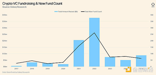 尽管2025年投资活动有所改善,但募资依然充满挑战。经历了2022-2023年的市场低迷后,资产配置者依然保持谨慎,加密基金还面临着来自人工智能以及现货交易所交易产品(ETP)等流动性工具和其他公开市场投资选项的竞争。第四季度11只基金募集到19.8亿美元,这是一个进步,但更广泛的信号表明,基金的设立仍接近周期低点,基金经理必须更加努力地争取投资承诺。