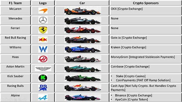 而今年的F1赛事即将在3月启程,去年,加密货币行业仅在F1赞助项目上就花费了1.74亿美元。 今年,加密货币赞助达到了新高:11 支球队共有 9 家公司赞助。