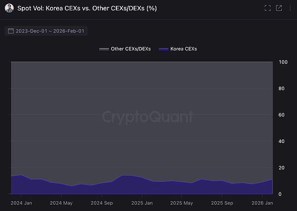 据CryptoQuant数据显示,在2024年第四季度迎来高峰期后,从2025年开始韩国加密市场占全球份额基本一直稳定在8%~11%区间。在情绪消极、流动性枯竭的近几个月中,该国市场占全球市场份额出人意料地反而还略有回升。