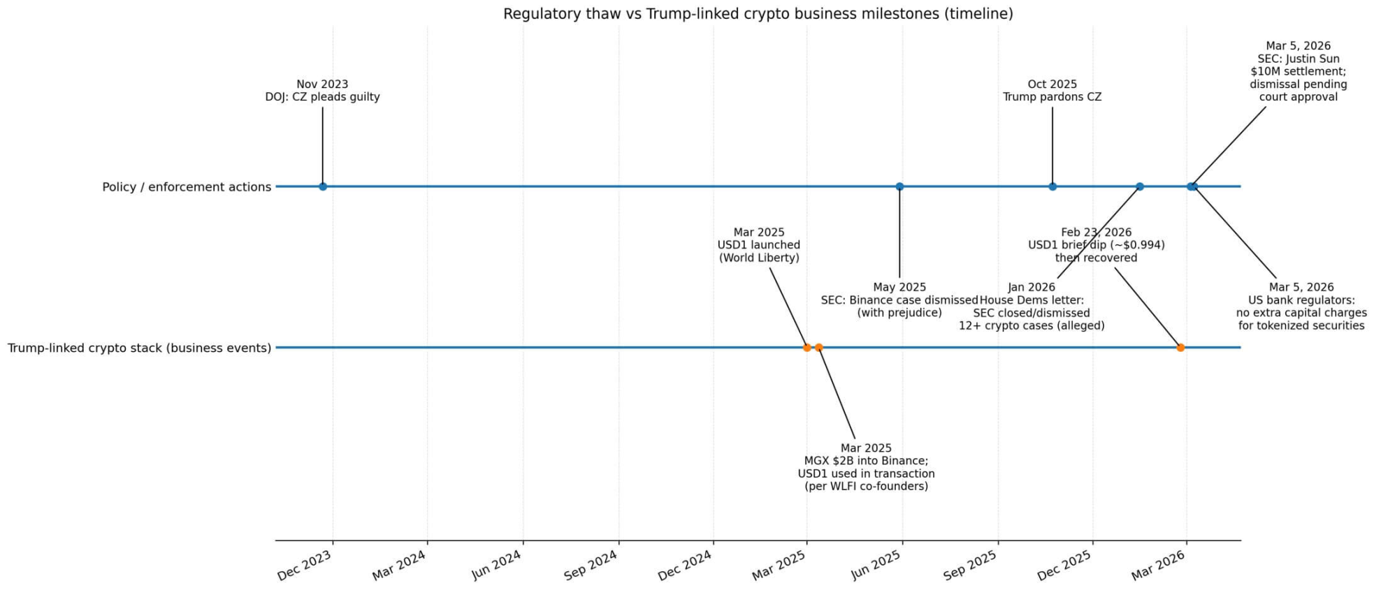 2025 年 5 月,SEC 对币安的民事诉讼被撤销且不得重新提起。2025 年 10 月,特朗普赦免了币安创始人赵长鹏(CZ)——后者于 2023 年 11 月认罪反洗钱和无牌汇款指控,缴纳了数十亿美元罚款,并服刑四个月。