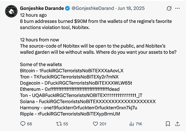 一个叫做 Gonjeshke Darande,波斯语意为"掠夺之雀"的黑客组织在 X 上发帖,声称自己攻入了 Nobitex 的热钱包,取走了超过 9000 万美元。就在前一天,这个组织才刚刚攻击了伊朗最大的国有银行之一Bank Sepah。