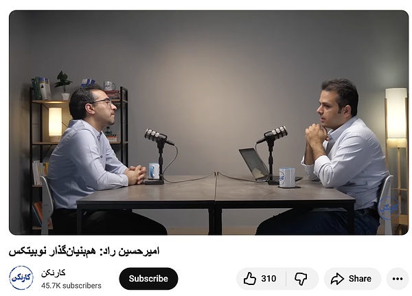 去年, 他上了伊朗一档很受欢迎的商业播客 Karnakon Podcast,有趣的是,这档节目的名字意译成中文大概是:"别当打工人!"