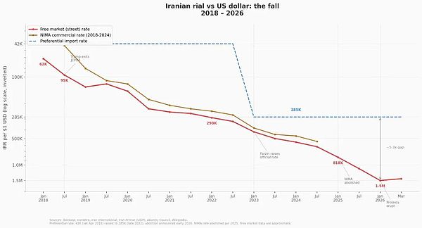 挖矿的故事在不同国家有不同版本,货币贬值的故事也是。Nobitex 那几年为什么增长极快?因为恰恰是里亚尔崩得最狠的时候,2018 年黑市上 9.2 万兑 1 美元,如今已经跌破 150 万。