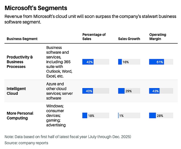 这依然是微软的核心业务。在其2026财年上半年,“生产力与业务流程”部门实现销售额670亿美元,占公司营收的42%,并贡献了公司一半以上的营业利润。该部门销售额同比增长16%,对于一项成熟业务来说,表现强劲。这一业绩也推动微软股价在去年7月攀升至每股555美元的峰值,使公司市值突破4万亿美元。