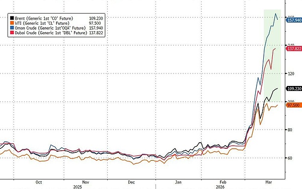 布伦特原油周五结算价站上112美元/桶上方,为2022年中以来最高水平,本周累涨约9%,本月累涨近50%。迪拜原油期货单日暴涨16.48%。