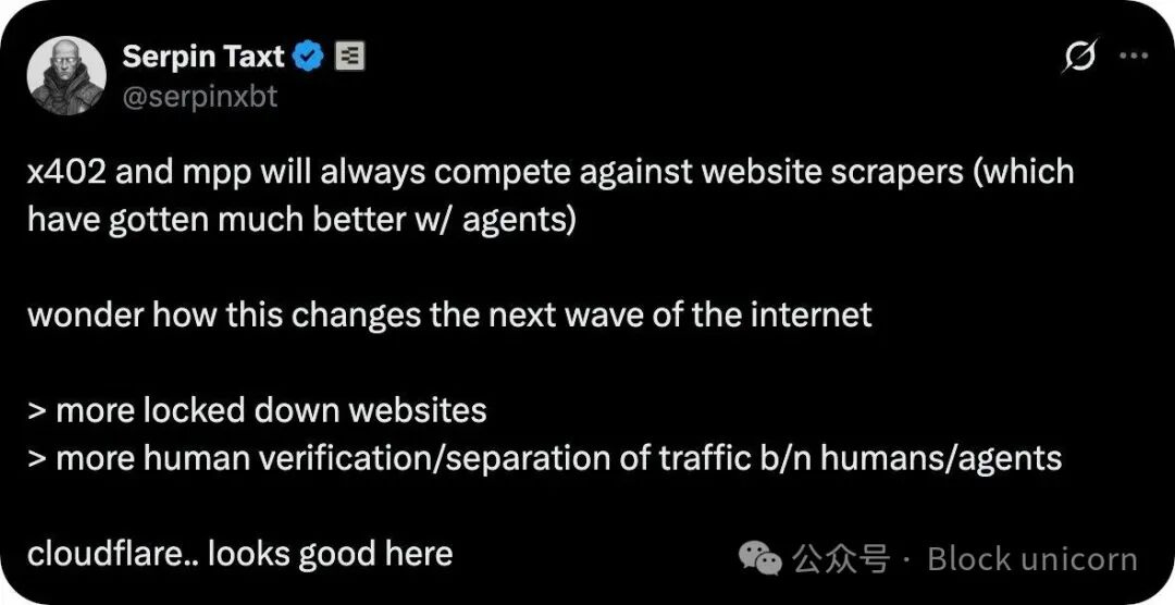 正如 Ethos Network 的创始人 Serpin 本周指出的那样:“这种网页抓取动态意味着互联网将会发生改变……网站将更加封闭,需要更多的人工验证,用户流量和代理流量之间也将更加隔离。”