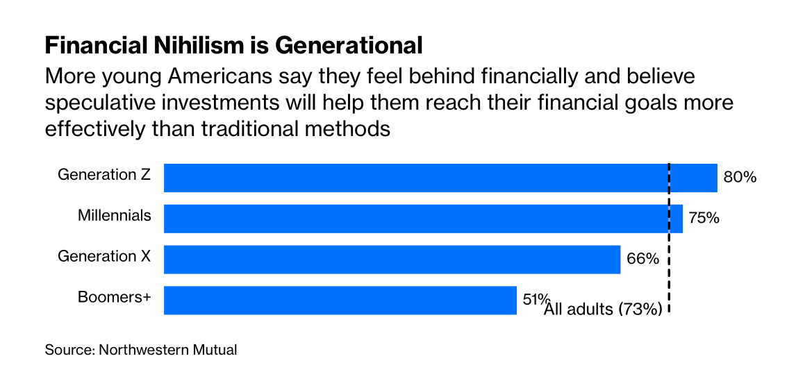 根据 Northwestern Mutual 的一项调查,80% 的 Z 世代和 75% 的千禧一代感到落后,这种感觉驱使着他们进行投机。