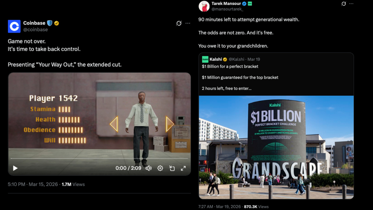 这种理念也体现在他的产品中。Coinbase 预测市场的宣传口号,直白地说就是“夺回控制权”。其预测市场竞争对手 Kalshi 的宣传语是“让你的子孙后代为你感到骄傲”。