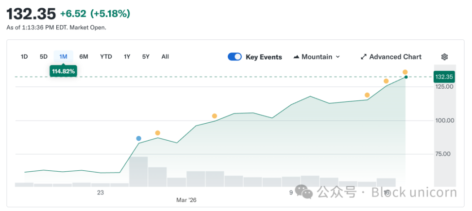 Circle 原本不应该属于这一类。它的代币价值始终固定为 1 美元,这是设计使然。稳定性是其产品的核心。然而,Circle 的股票价格却从 2 月 5 日的 49.90 美元飙升至如今的约 123 美元,短短五周内翻了一番还多。与此同时,整个加密货币市场仍比 10 月份的峰值低 44%。