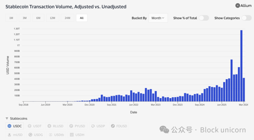 交易数据也印证了这一点。仅在二月份,USDC 的调整后交易量就达到了约 1.26 万亿美元,而同期 USDT 的交易量为 5140 亿美元。尽管 Tether 的市值仍高达 1840 亿美元,而 USDC 的市值仅为 790 亿美元。从总供应量来看,两者差距悬殊。但如今 USDC 的交易量已经超过了 USDT。